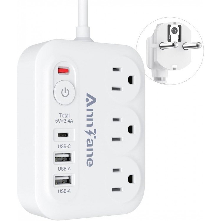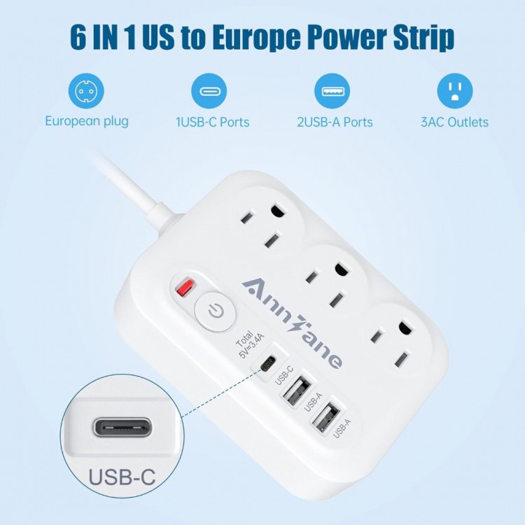 - 【USB-C Fast Charging】1 Type-C (5V/3.0A), 2 USB A ports (5V/2.4A),3 AC sockets, 6-in-1 multi-function European travel plug adapter, which can quickly charge your mobile phone, tablet computer, and other electronic devices. The socket's built-in smart technology can detect the charging device and automatically provide the best charging speed (the actual current is determined by the device's demand).